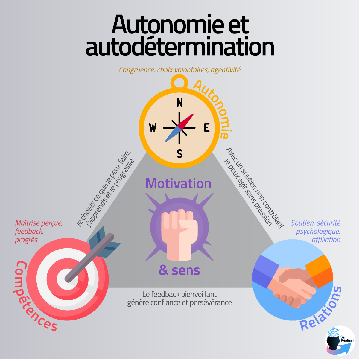 L’autonomie est au cœur de la théorie de l’autodétermination1. Il s’agit d’un besoin fondamental, tout comme les besoins de compétence et de relation. Dans cette perspective, une action autonome est avant tout auto‑déterminée : l’individu la réalise parce qu’elle entre en résonance avec ses valeurs et ses buts. De multiples travaux expérimentaux montrent que, lorsque ce besoin est nourri, la motivation intrinsèque augmente, les apprentissages sont plus profonds et la persévérance s’en trouve renforcée1. À l’inverse, un environnement contrôlant, qui restreint le champ des décisions, entraîne désengagement, stress et moindre créativité.